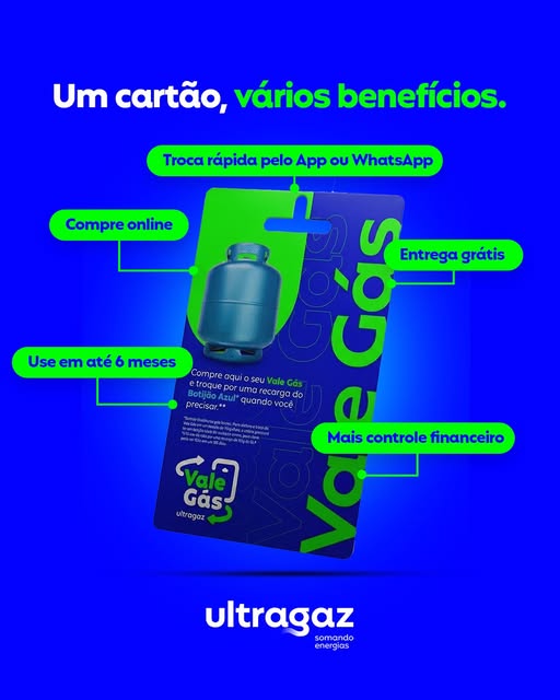 Com o nosso Vale Gás, você organiza, planeja e ainda garante seu botijão de gás sem dor de cabeça.💙 Compre, guarde e use quando precisar, simples assim. Só não pode esquecer que a validade do cartão é de 185 dias, certo?😉 📲 Adquira já o seu em nosso app ou em lojas parceiras. #Ultragaz #ValeGás #BotijãoDeGás ____ #ParaTodosVerem: Imagem em tons de azul e verde apresentando o cartão Vale Gás Ultragaz. No centro da imagem, o cartão físico é cercado por balões informativos que destacam benefícios como entrega grátis, compra online, controle financeiro e validade de 6 meses. O título no topo reforça: ''Um cartão, vários benefícios''.